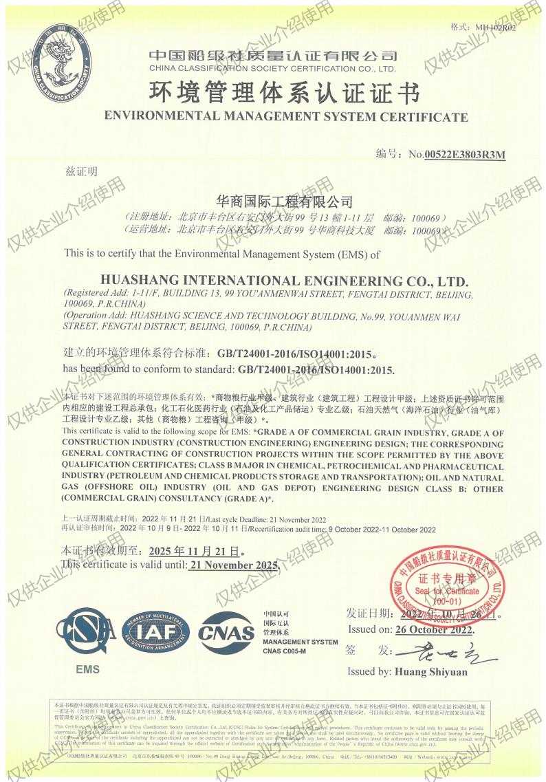 As a leading professional engineering Chinese company in the commercial grain industry, which has the qualifications of engineering consulting, engineering design, urban planning, construction supervision, construction cost consulting, general contracting of construction engineering, and mechanical & electrical engineering covering agricultural food, cold chain logistics, civil construction, Ice & Special Refrigeration, petroleum storage and transportation, biological medicine, and other areas—providing customers with the whole industry chain and complete life cycle services in agricultural, grain and food, and cold chain logistics engineering. Since Huashang International Engineering Co., Ltd. has established in 1954, the company completed more than 4,000 projects in professional fields, covering all provinces and cities in China and more than 50 countries and regions worldwide.