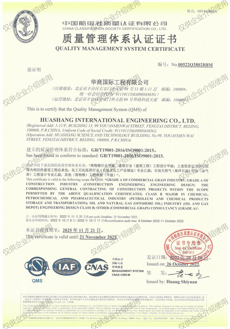 Huashang International Engineering Co., Ltd. has a technical talent team in the industry, with over 500 employees, including 365 engineers and technicians with intermediate and senior specialized titles, more than 140 national registered engineers of various specialties, and 30 experts enjoying special allowances from the State Council. For a long time, the company has valued and developed the corporate culture, made win-win with partners, and made progress together with customers, and has won the "National Spiritual Civilization Unit," "The Central Enterprise Civilization," "The Central Enterprise Advanced Collective" and other honorary titles.